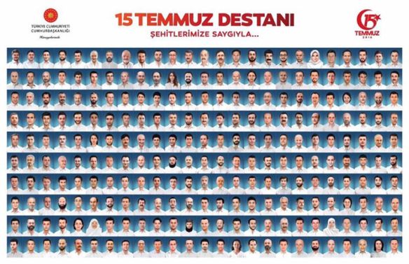 Millî İradeyi ve demokrasiyi koruma uğruna tanklara, mermilere ve bombalara vücudunu siper eden 250 vatandaşımız Şehitlik mertebesine ulaşmış; 2712 vatandaşımız da gazi olmuştur. Bir milleti millet yapan ortak kader ve gelecek duygusuna tekabül eder şekilde kahramanlık örnekleriyle dolu 15 Temmuz gecesinde; hain terör örgütünü engellemek için arkamda kimse var mı diye bakmaksızın direniş gösteren, canı pahasına göğsünü silahlara, tanklara siper eden Şehitlerimiz, Gazilerimiz ve milletimizin tüm mensupları ülkemizin şanlı tarihinde yerlerini almıştır.